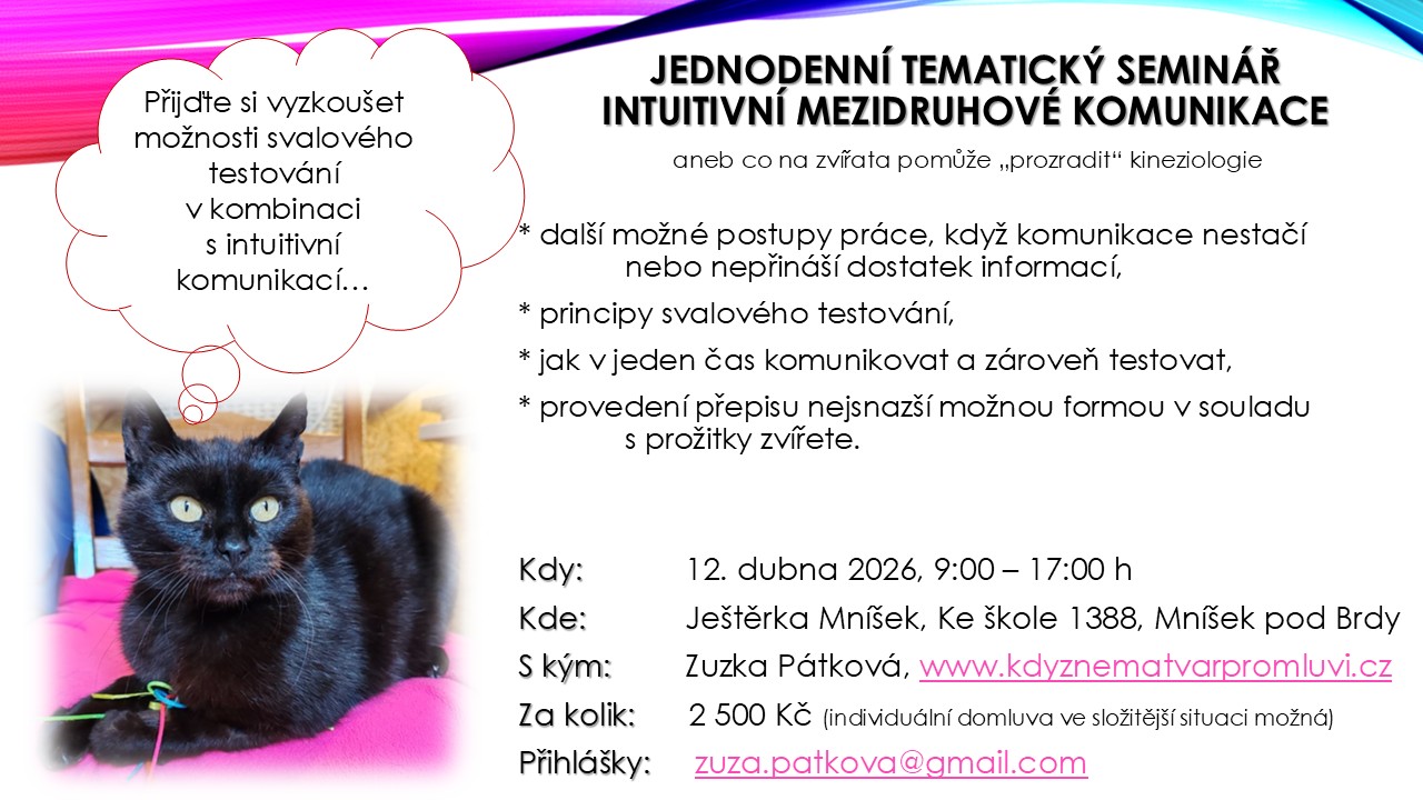 Přihlašování otevřeno pro absolventy jednodenky komunikace + kineziologie, vypsáno v termínech: 30.11.2025 Brno, 22.2.2026 Brno, 12.4.2026 Mníšek. S těmi, kdo tuto jednodenku neabsolvovali se budu domlouvat individuálně, buď doplní tento dubnový termín, pokud budou volná místa (rovněž si doplní potřebné znalosti), anebo bude vypsán jiný termín