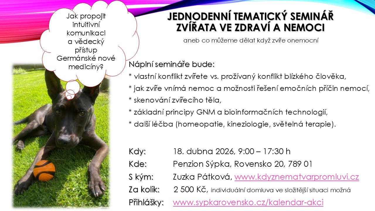 Seminář nabídne informace, o tom jak zvířata prožívají emoce, jak lze odhalit příčinu vzniku nemoci a jaké jsou možnosti návratu ke zdraví. Seminář bude veden s hlubokým respektem