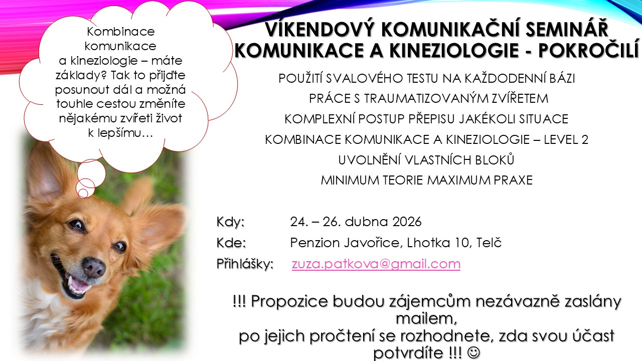 Seminář je věnovaný absolventům komunikačních základů, kteří s kineziologií začínají nebo ji neznají. Zvířata stejně jako my lidé prožívají traumatizující situace, které se propisují do struktury jejich bytosti a mohou je omezovat v jejich dalším životě. Naučíte se jak respektovat individuální prožitky zvířete, když komunikace jako jediný nástroj nestačí.